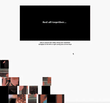 Navigate between different videos using the arrow keys, or click on any of the debris tiles to see that video again! This project was built in P5.js and the physics forces/simulation was done using the Matter.js library.