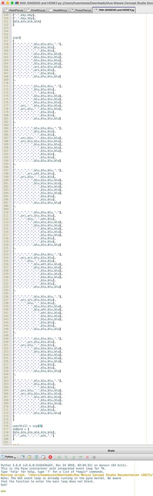 Character animations like sipping the tea was done by copying/pasting a series of the same character sprite, making adjustments as needed. The background was done in the same way, and I think I even broke the arrays up into two side-by-side sections because the whole scene was too long to fit right to my own style specifications.